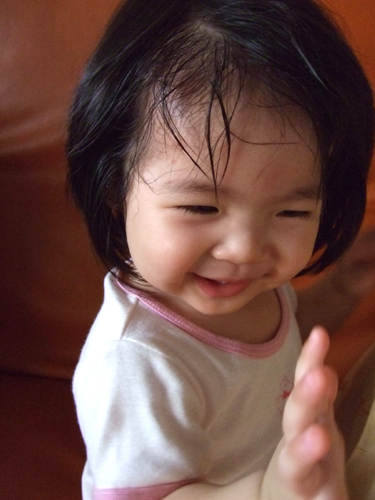 小郁真的是很愛笑的小孩。 不過,隨著她一天天長大,也慢慢學到不順心時,想要玩什麼東西大人又不給玩時,可以用哭當手段來達成目的。