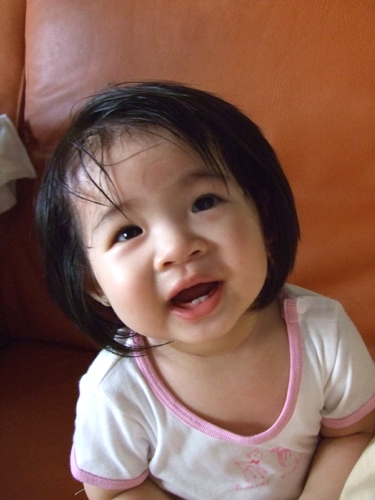 (白底粉紅邊的包屁衣,是最近從敏薰媽家買來的,料子很好呢。) 拍到小牙牙了,終於。之前也有拍到,但不是糊掉就是表情不太妙。 小郁長牙速度好像比較慢,也好,咬人痛的程度進階也會慢一點。 雖然已經不餵母乳很久,不用擔心被咬的錐心之痛,但小妞要是比我早起,她叫我起床的方式通常都很暴力,咬我的手是其中一種。 天氣漸漸熱起來,以後這樣滿頭大汗的照片,應該會爆增。