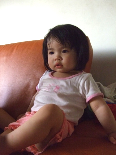 皮蛋啊。好好的椅子不坐,非得坐在扶手上。 照片看起來好像很大的小孩,常常被誤以為是二三歲的小朋友,但本人很小隻啊。 是姨姨拍照的技巧關係? 還是為娘的我把妳的臉生得太臭老?