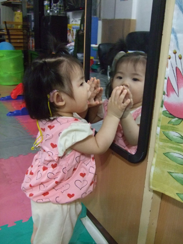 在保母家,也是很愛照鏡子,高度也剛好是小孩可以照得到的。